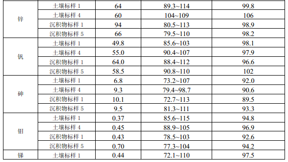 11.4 每批次樣品至少分析 10% 的加標(biāo)回收樣,樣品數(shù)量小于 10 個(gè)時(shí),應(yīng)至少做一個(gè)加標(biāo) 回收樣。加標(biāo)回收樣測(cè)定結(jié)果中,電熱板消解測(cè)定鎘(Cd)、鈷(Co)、銅(Cu)、鉻(Cr)、 錳(Mn)、鎳(Ni )、鉛(Pb)、鋅(Zn)、釩(V)、砷(As)的加標(biāo)回收率應(yīng)控制在 70% ~ 125%之間,鉬(Mo)、銻(Sb)的加標(biāo)回收率應(yīng)控制在 50% ~125%之間;微波消解測(cè)定 12 種金屬元素的加標(biāo)回收率應(yīng)控制在70% ~125%之間。