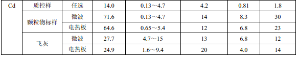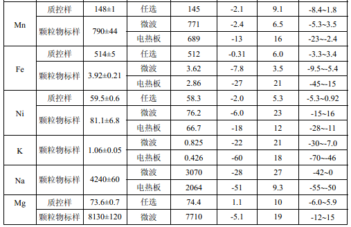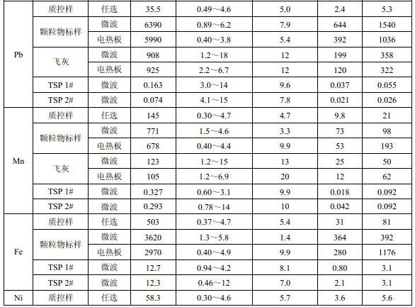 濾膜質(zhì)控樣品由美國職業(yè)健康研究所提供(A-3.1)。顆粒物標(biāo)樣為美國 NIST(1648a)。 樣品消解處理采用硝酸-鹽酸混合溶液(5.6),定容體積為 50.0 ml。不同類型樣品測(cè)定值濃 度(或含量)單位分別為:質(zhì)控樣(μg )、顆粒物標(biāo)樣(μg/g)、飛灰樣品(μg/g)和 TSP 樣品(μg/cm 2 )。其中顆粒物標(biāo)樣中 Al 、Ca、K 元素含量單位為重量百分比(% )。