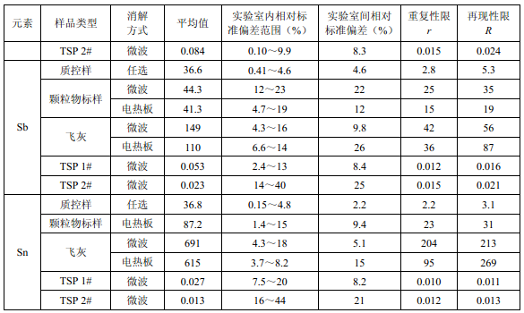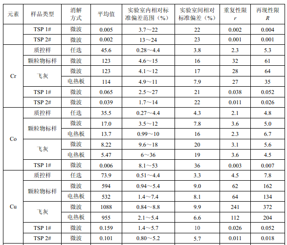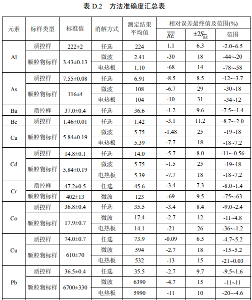 7家實(shí)驗(yàn)室分別對(duì)統(tǒng)一提供的大氣顆粒物標(biāo)樣、濾膜質(zhì)控樣品、飛灰樣品(廢氣顆粒物模擬樣品)和2 個(gè)顆粒物負(fù)載量不同的TSP 樣品,同時(shí)取6 份平行樣品分別進(jìn)行微波消解 (7.2.1.1 )和電熱板消解(7.2.1.2 ),用等離子體發(fā)射光譜法測(cè)量。對(duì)測(cè)定結(jié)果進(jìn)行數(shù)理統(tǒng) 計(jì),得到方法的精密度(各元素測(cè)定值的實(shí)驗(yàn)室內(nèi)標(biāo)準(zhǔn)偏差范圍、實(shí)驗(yàn)室間標(biāo)準(zhǔn)偏差、重復(fù) 性限和再現(xiàn)性限)和方法的準(zhǔn)確度(各元素測(cè)定值的相對(duì)誤差范圍和相對(duì)誤差最終值),詳 見附錄D。