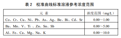 基于顆粒物樣品實(shí)際化學(xué)組成,表2 給出了標(biāo)準(zhǔn)溶液濃度參考范圍。建議在此范圍內(nèi)除 標(biāo)準(zhǔn)系列空白溶液(5.9),依次加入多元素標(biāo)準(zhǔn)儲(chǔ)備液(5.13 )配制3 ~5個(gè)濃度水平的標(biāo)準(zhǔn)系列。各濃度點(diǎn)用硝酸溶液(5.9)定容至50.0 ml??筛鶕?jù)實(shí)際樣品中待測(cè)元素濃度情況調(diào) 整校準(zhǔn)曲線濃度范圍。