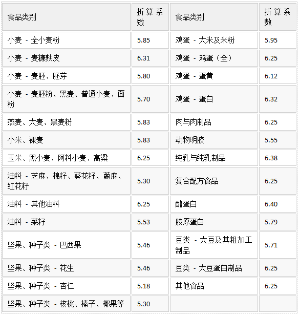 常見食物中的氮折算成蛋白質(zhì)的折算系數(shù)