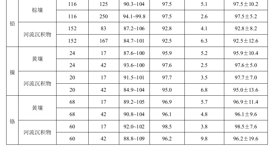 本標(biāo)準(zhǔn)適用于土壤和沉積物中銅、鋅、鉛、鎳和鉻的測(cè)定。當(dāng)取樣量為0.2g、消解后定容體積為25 ml時(shí),銅、鋅、鉛、鎳和鉻的方法檢出限分別為1 mg/kg、1 mg/kg、10 mg/kg、3 mg/kg和4 mg/kg,測(cè)定下限分別為4 mg/kg、4 mg/kg、 40 mg/kg、12 mg/kg和16 mg/kg。