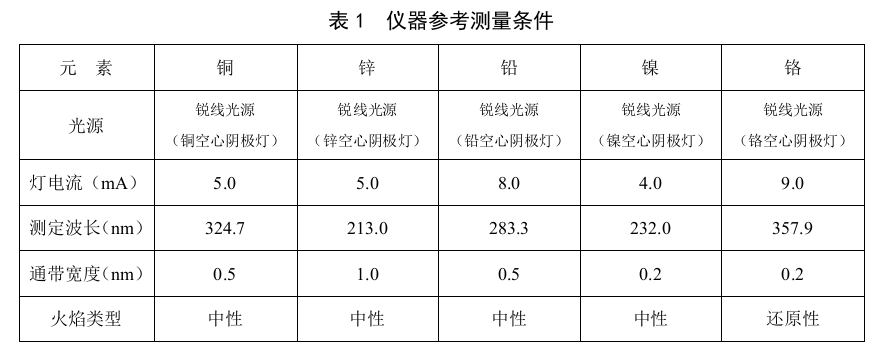 土壤和沉積物經(jīng)酸消解后,試樣中銅、鋅、鉛、鎳和鉻在空氣-乙炔火焰中原子化,其基態(tài)原子分別對(duì)銅、鋅、鉛、鎳和鉻的特征譜線產(chǎn)生選擇性吸收,其吸收強(qiáng)度在一定范圍內(nèi)與銅、鋅、鉛、鎳和鉻的濃度成正比。