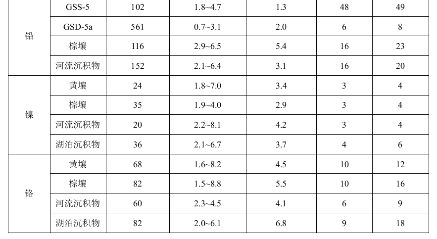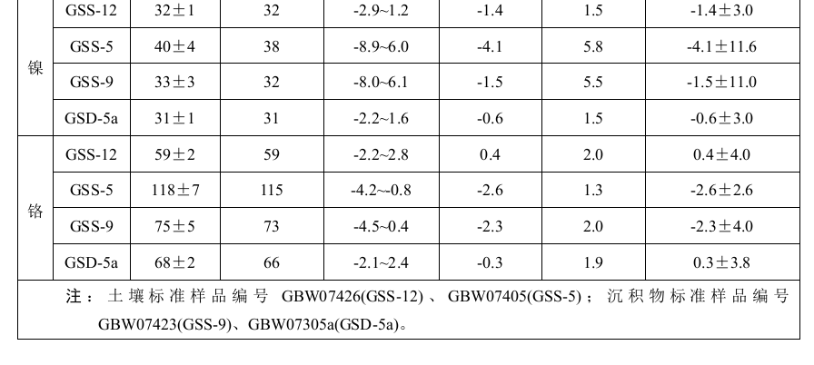 六家實(shí)驗(yàn)室分別對(duì)有證標(biāo)準(zhǔn)樣品GSS-5和GSD-5a中的鉛進(jìn)行了6次重復(fù)測(cè)定:相對(duì)誤差范圍分別為-0.5%~3.0%和-1.9%~2.9%;相對(duì)誤差最終值分別為1.7%±2.8%和 0.3%±4.2%。 六家實(shí)驗(yàn)室分別對(duì)有證標(biāo)準(zhǔn)樣品GSS-12、GSS-5、GSS-9和GSD-5a中的鎳進(jìn)行了6次重復(fù)測(cè)定:相對(duì)誤差范圍分別為-2.9%~1.2%、-8.9%~6.0%、-8.0%~6.1%和-2.2%~1.6%;相對(duì)誤差最終值分別為-1.4%±3.0%、-4.1%±11.6%、-1.5%±11.0%和-0.6%±3.0%。 六家實(shí)驗(yàn)室分別對(duì)有證標(biāo)準(zhǔn)樣品GSS-12、GSS-5、GSS-9和GSD-5a中的鉻進(jìn)行了6次重復(fù)測(cè)定:相對(duì)誤差范圍分別為-2.2%~2.8%、-4.2%~-0.8%、-4.5%~0.4%和-2.1%~2.4%;相對(duì)誤差最終值分別為0.4%±4.0%、-2.6%±2.6%、-2.3%±4.0%和0.3%±3.8%。