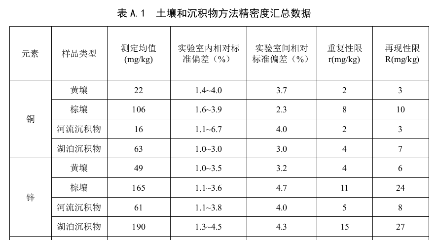 家實(shí)驗(yàn)室對(duì)不同類型的土壤和沉積物統(tǒng)一樣品進(jìn)行了測(cè)定,方法的重復(fù)性和再現(xiàn)性等精密度數(shù)據(jù)見表A.1。