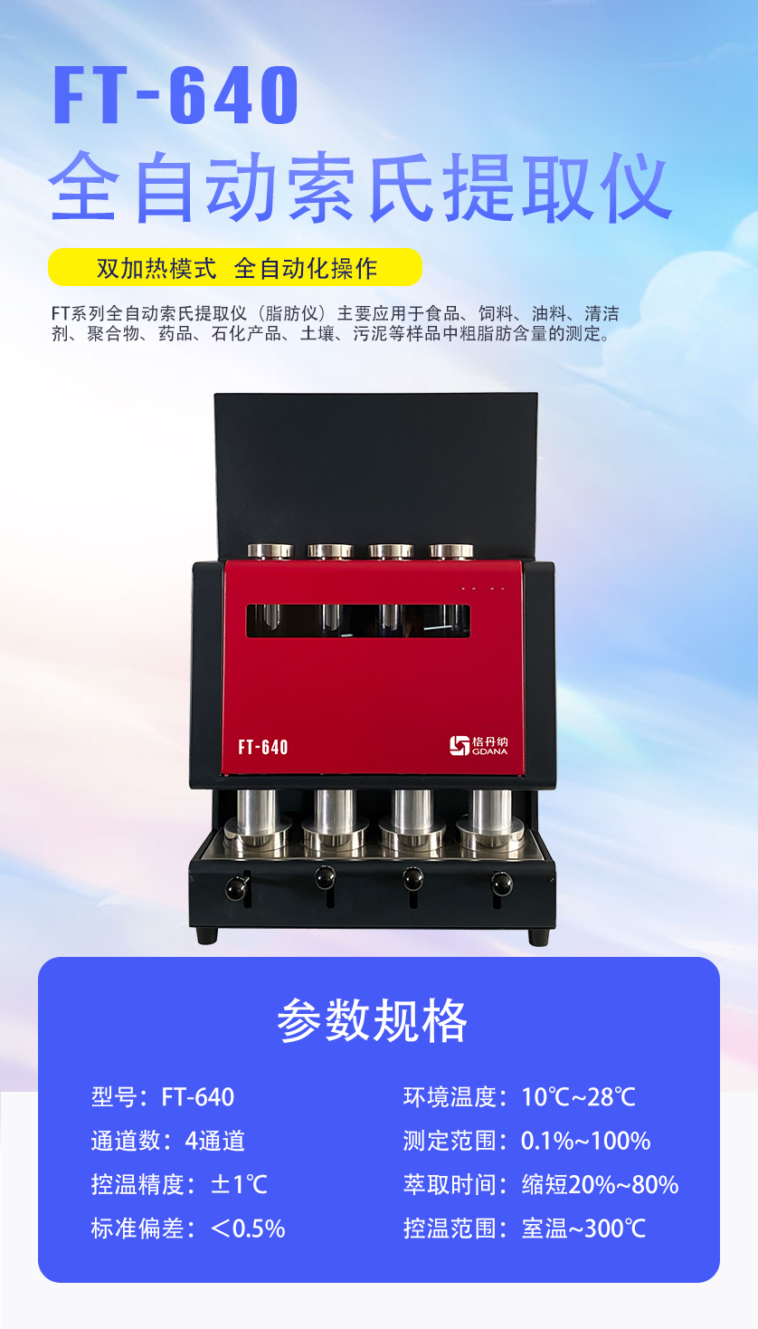 FT640索氏提取自動(dòng)脂肪儀主要應(yīng)用于食品、飼料、油料、清潔劑、聚合物、藥品、石化產(chǎn)品、土壤、污泥等樣品中粗脂肪含量的測(cè)定。