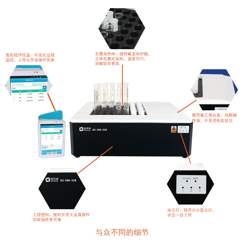 DS-360-42H石墨消解儀采用高純石墨材料作為加熱體,包裹式加熱,效率更高,溫度均勻性更好;多孔設計,輕松實現(xiàn)樣品的批量處理,是您樣品消解的好伴侶。