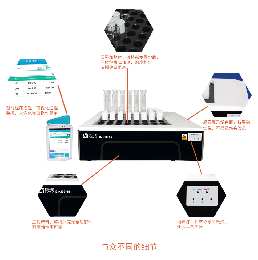 DS-360-56智能石墨消解儀具有56孔高通量設(shè)計,可快速實現(xiàn)樣品批量處理,滿足樣品量大的消解用戶;石墨材料作加熱體,孔間溫差±1.5℃,溫度均性好;無線控制,有效避免人員被酸霧及熱量傷害;設(shè)備操作簡單,消解快速,是樣品元素分析時消解的好助手。
