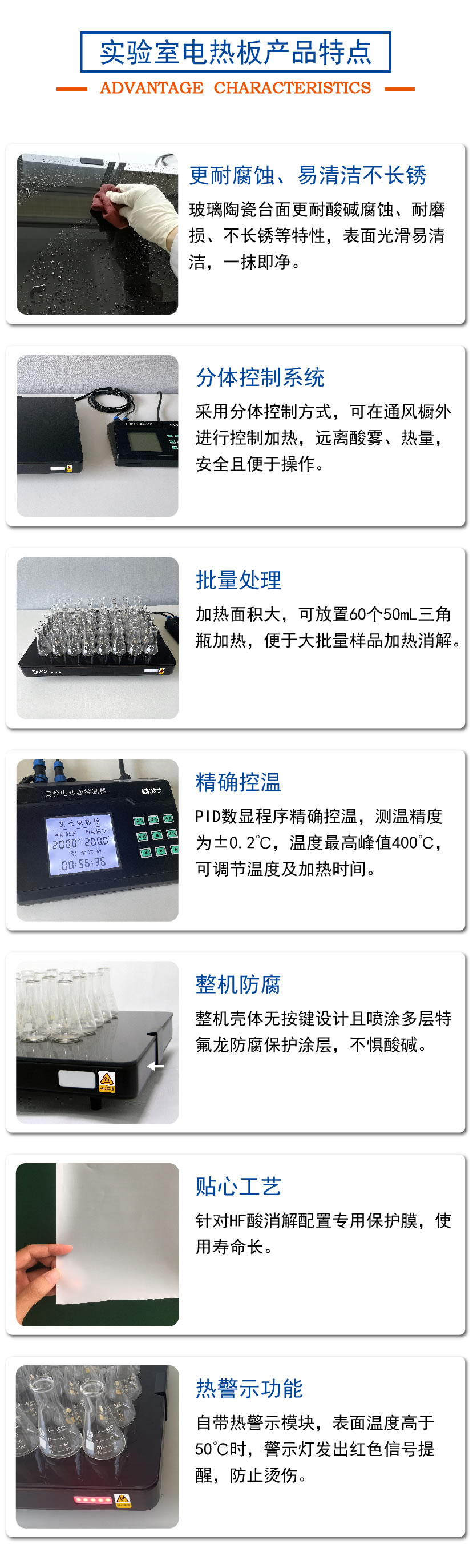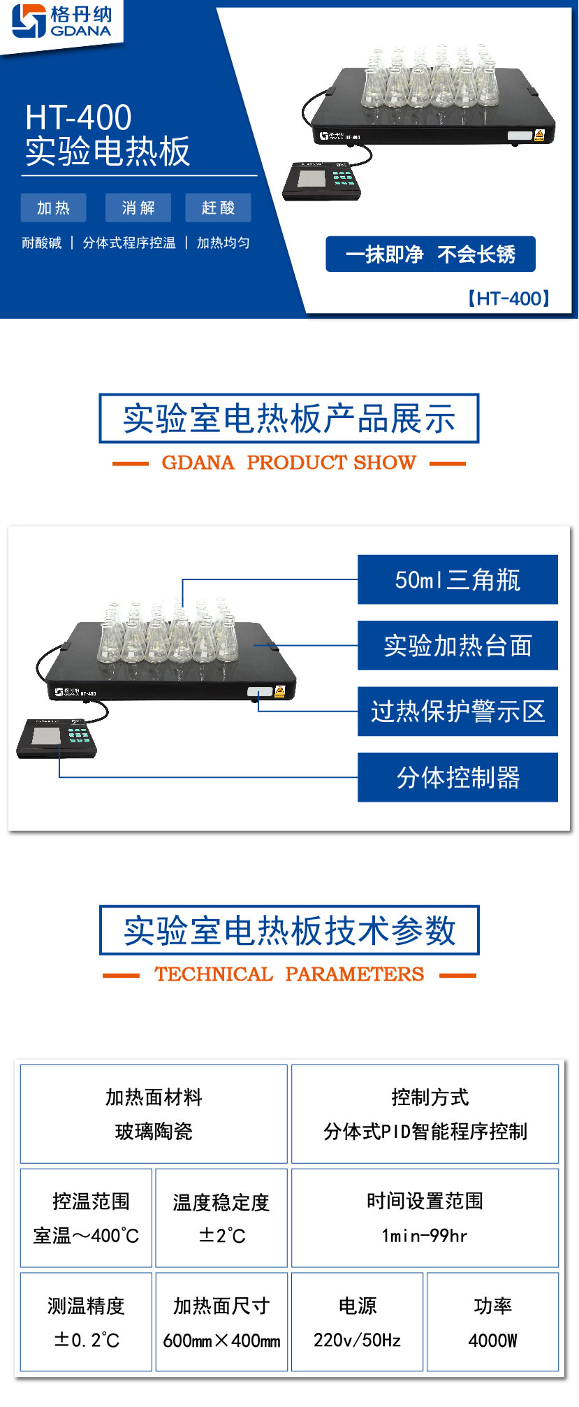 HT-400陶瓷加熱板專用于無機化學(xué)元素分析時對各類樣品作加熱、消煮、趕酸用的恒溫加熱裝置。臺面具有耐酸堿,不生銹等特性;分體PID程序數(shù)顯控溫,是實驗室樣品預(yù)處理好助手。