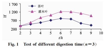 由表3和圖1可知:消化溫度控制在160~180C之間消化時間在6~7h之間時,兩種植物樣品硒的提取完全;當消化溫度<160C,或>180C時,消化時間過短或過長時,硒消化不徹底或容易揮發,都會導致熒光值偏低且不穩定。