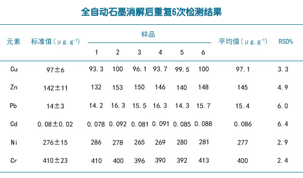 分別稱取0.5g(精確至0.0001g)GBW07407(GSS-7)土壤樣品各6份,用全自動石墨消解儀法對樣品進行消解,然后用進行分析,所得標準土壤樣品的準確度和精密度結(jié)果如下表格。