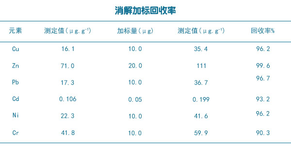 稱取若干份0.5g(精確至0.0001g)棕壤土樣品,分成平行的兩組,其中一組加入一定質(zhì)量的標液,然后用全自動石墨消解儀法對兩組樣品進行消解,完成后對土壤樣品中的Cu、Zn、Pb、Cd、Ni和Cr六種重金屬元素含量進行分析,計算樣品加標回收率如下表所得。