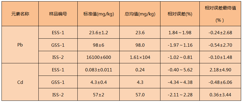 采用方法四中的步驟對鉛、鎘的ESS-1、GSS-1和ISS-2標準樣品進行了消解測定鉛、鎘準確度結果如下表所示: