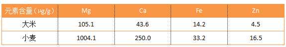 谷物中含有多種金屬離子,大部分對于身體健康有重要作用,其含量范圍集中在10-100 μg/g,屬于微量分析。對于金屬的處理,大部分的現有文獻采取的是以混合強酸加熱并溶解的方法,但是這種方法本身極具危險性,而且環境有極大的影響。所以本次實驗中選擇進行長時間的灰化以除去有機物,代替酸解的方法。